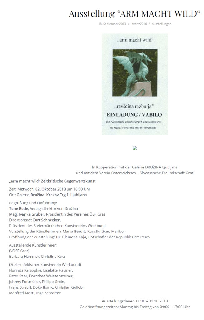 Ausstellungen Künstlerhaus Halle für Kunst & Medien Burgring 28010 Graz, Austria https://de.wikipedia.org/wiki/K%C3%BCnstlerhaus_Graz Ausstellung “ARM MACHT WILD“ http://www.druzina.si/ICD/spletnastran.nsf/clanek/150-let-inovacij-na-ogled-v-galeriji-druzina?Open http://www.werkbund.at/ausstellung.html Teilen mit: Auf X teilen (Wird in neuem Fenster geöffnet) X Auf Facebook teilen (Wird in neuem Fenster geöffnet) Facebook Gefällt mir Wird geladen …
